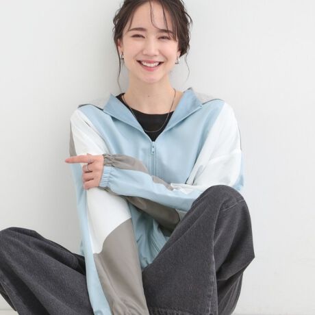 軽やかな素材感と切り替え配色デザインがポイントのフードブルゾン。