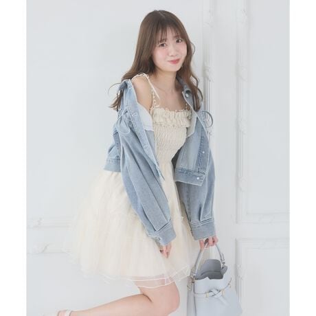 スカート部分はたっぷりとギャザーフリルを重ねたティアード仕様で、繊細なレースをあしらいフェミニンな雰囲気を演出します。