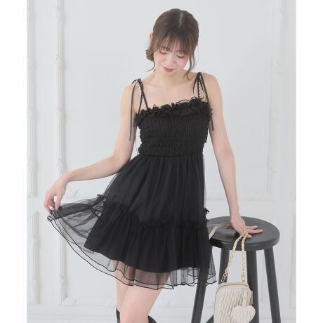 スカート部分はたっぷりとギャザーフリルを重ねたティアード仕様で、繊細なレースをあしらいフェミニンな雰囲気を演出します。