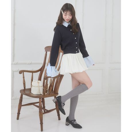 袖口にはフリルと大きなリボンをあしらい、手元にガーリーなアクセントをプラス。さりげない華やかさでコーディネートをフェミニンに仕上げてくれます。