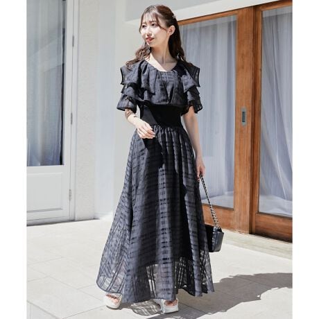 大きなフリルから覗くデコルテラインと肩の肌みせが大人あざとさを演出。