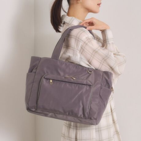 上品な光沢感のある生地にゴールド金具が映える、シンプルで女性らしいA4トート。