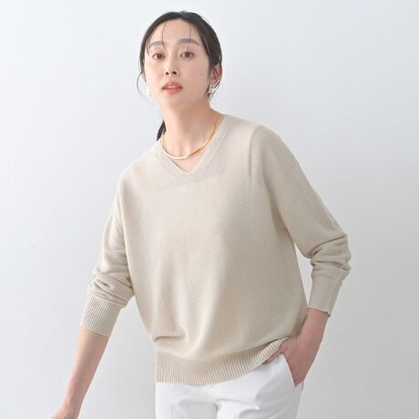 ホールガーメント特有の滑らかな仕上がりが特徴の深すぎないVネックがデコルテを美しく見せてくれるプルオーバーニット。