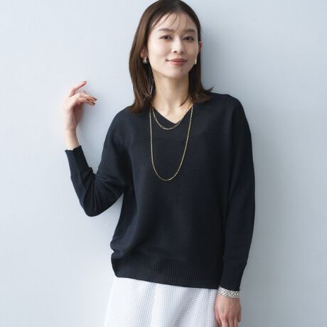 ホールガーメント特有の滑らかな仕上がりが特徴の深すぎないVネックがデコルテを美しく見せてくれるプルオーバーニット。