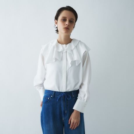 ・品の良いボリューム感をプラスする大人フェミニンなラッフルカラーブラウス。