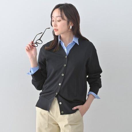 シャープな印象のVネックカーディガンはフロントボタンの仕様で着こなしの幅が広がるのが魅力。