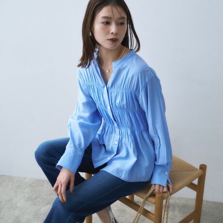 フロントに施されたシャーリングが特徴的なブラウスです。