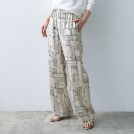 ブロッキングアートペイントが目を引くイージーパンツ。