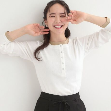 ヘンリーネックのボタンがアクセントとなり、シンプルながらもこなれ感のある一枚です。