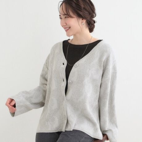 幾何柄風の凹凸が特徴的な編地でお作りしたシンプルなVネックカーディガン。
