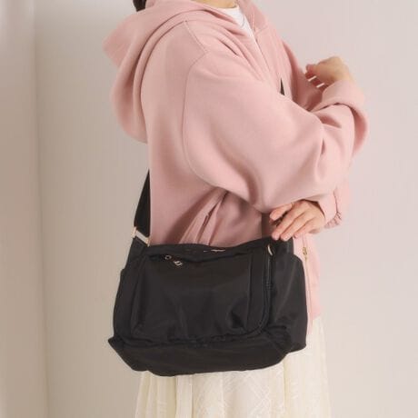 金具はゴールドで上品に仕上げ、ショルダーは長さ調節ができて肩掛け・斜め掛けどちらも快適。