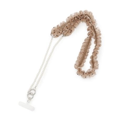 ドットのフロッキープリントのチュールリボンとフェイクパールを組み合わせたロングストラップ。