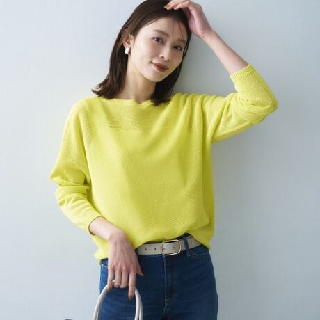 ざっくりした編地で女性らしいボートネックが首元をすっきり見せてくれます。