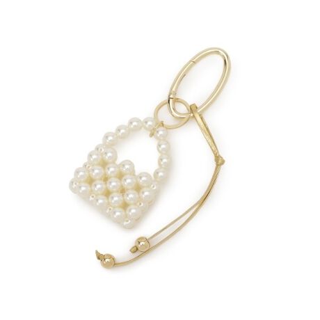 フェイクパールとクリアビーズの2色で手編みされたミニバッグのバッグチャーム。