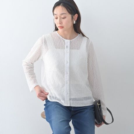 繊細なストレッチレースのカーディガンはシンプルながらもレースの素材感が上品でフェミニンなアクセントを与えています。
