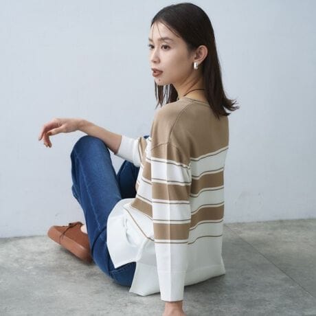 クリーンで洗練された大人のボーダー柄が目を引く、八分袖のボートネックプルオーバー。