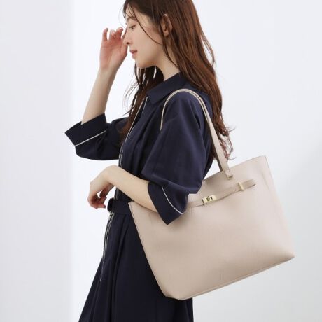 シボ感のある合皮素材にフロントの金具がアクセントとなり、シンプルながらも上品さを感じさせるデザイン。