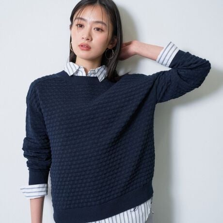 凹凸のあるふくれジャガード編みが、シンプルながらも奥行きのある表情を演出します。