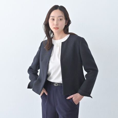 無地見えツイード素材の女性らしいペプラムジャケット。