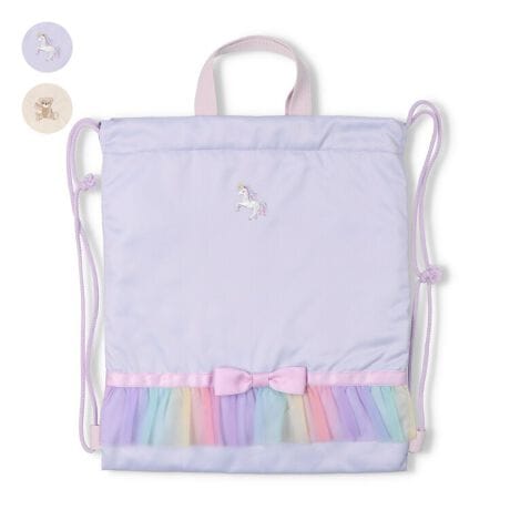 入園・入学準備品!通園、通学、遠足や普段のおでかけなどにも!ポリエステルで軽く持ちやすいナップサックです。リュックとして背負ったり、持ち手が付いているので手持ちのバッグ、サブバッグとしても使えます!ラベンダーはユニコーンの刺繍にレインボーカラーのチュールのフリル。ベージュはくまの刺繍にギンガムチェック柄のチュールのフリル。どちらもリボンもポイントに!女の子らしいナップザック。同じ柄で通園バッグ(B27621)、巾着(B27625、B27637)、ランチョンマット(B27830)、エプロン(B27829)、レッスンバッグ(B27620)、シューズバッグ(B27623)があるので、入園、入学準備で色々なアイテムを同じ柄に揃えることも出来ます。【アイテム】 雑貨 カジュアル お洒落 オシャレ かわいい 可愛い 普段着 デイリーウェア お出かけ 子ども こども 女児 女の子 ガールズ キッズ ベビーサイズ トドラーサイズ 幼稚園 保育園 小学校 通園 通学 小学生 遠足 旅行 2026年春夏物新作 丸高衣料 小物 パープル ラベンダー 薄紫色 入園入学準備品 クマ 動物 アニマル キッズフォーレ バックパック
