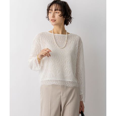 繊細な総レースが目を惹く、エレガントなプルオーバーです。ニット素材を極力薄く仕上げることで、トレンド感のある軽やかな透け感を表現しました。袖口と裾にはレースの編み端を活かしたスカラップデザインを採用し、細部まで贅沢なつくりになっています。 こちらは前後着用可能な2WAY仕様となっており、リボンを垂らしてキーネック風に着こなせば、顔周りに抜け感をプラスできます。キャミソールやタンクトップとのレイヤードで、程よい肌見せを楽しむスタイルがおすすめです。デニムを合わせて大人カジュアルに、きれいめスカートと合わせてディナーや華やかなシーンにと、ボトムス次第で幅広いコーディネートをお楽しみいただけます。 カラーは、肌馴染みが良く優しげな印象のアイボリー(#002)と、シックで洗練されたムード漂うブラック(#005)の2色展開です。