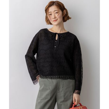 繊細な総レースが目を惹く、エレガントなプルオーバーです。ニット素材を極力薄く仕上げることで、トレンド感のある軽やかな透け感を表現しました。袖口と裾にはレースの編み端を活かしたスカラップデザインを採用し、細部まで贅沢なつくりになっています。 こちらは前後着用可能な2WAY仕様となっており、リボンを垂らしてキーネック風に着こなせば、顔周りに抜け感をプラスできます。キャミソールやタンクトップとのレイヤードで、程よい肌見せを楽しむスタイルがおすすめです。デニムを合わせて大人カジュアルに、きれいめスカートと合わせてディナーや華やかなシーンにと、ボトムス次第で幅広いコーディネートをお楽しみいただけます。 カラーは、肌馴染みが良く優しげな印象のアイボリー(#002)と、シックで洗練されたムード漂うブラック(#005)の2色展開です。