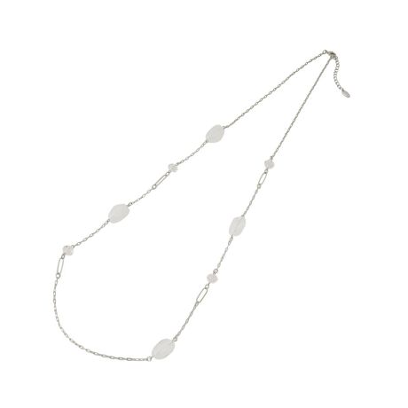 美しい色合いのストーンパーツを等間隔に連ねたロングネックレスです。ニュアンスの異なるマテリアルを組み合わせることで、光を受けて表情豊かな輝きを放ちます。縦のラインを強調する長めの設計はコーディネートにスマートなアクセントを添え、シンプルなカットソーやニットとも好相性。日本製の細やかなディテールが光り、日常のコーディネートを洗練された大人の佇まいへとアップデートしてくれます。