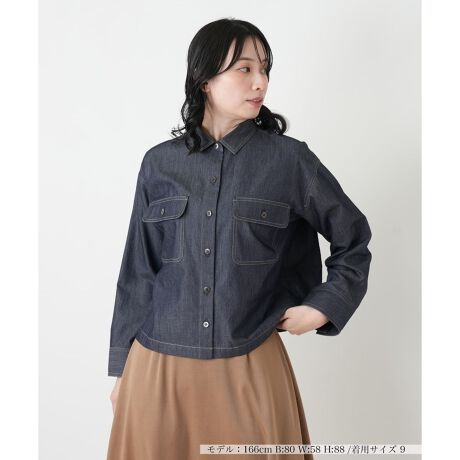 インディゴ染め特有の深みのある色合いが美しいデニムブラウスです。肩のラインを落としたドロップショルダーが、程よい抜け感と都会的なシルエットを演出します。さらりとした肌触りのやや薄手のデニム生地は、初夏の羽織りとしても重宝する軽やかな質感です。胸元の大きなポケットが存在感のあるアクセントを添え、袖口のボタンを開閉してラフに捲り上げるなど、着こなしのアレンジも自在に楽しめる一着です。