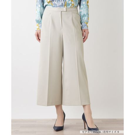 初夏のお出かけを快適にサポートする、汎用性に優れたガウチョパンツです。水や汚れを弾くはっ水加工を施したやや薄手の生地を使用しており、気兼ねなくデイリーに活躍します。コンフォートストレッチのしなやかな伸縮性がアクティブな動作を妨げず、フロントホックとファスナーの仕様が端正な見映えをキープします。広がりを抑えた程よいリラックス感のあるシルエットが脚のラインを美しく引き立て、オンオフを問わず品良く穿きこなせる一本です。