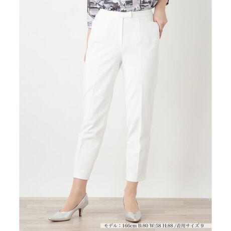 初夏のデイリーシーンに軽快さを添える、スマートな佇まいのクロップドパンツです。足首を覗かせる丈感が着こなし全体に爽やかな抜け感と女性らしさを演出します。肌当たりのよいしなやかなコンフォートストレッチ素材を使用しており、やや薄手の質感ながら、水や汚れを弾くはっ水加工が施されているため天候を気にせず着用可能。フロントホックの仕様がウエスト周りを端正に見せ、アクティブな動きにも美しく寄り添う汎用性に優れた一本です。