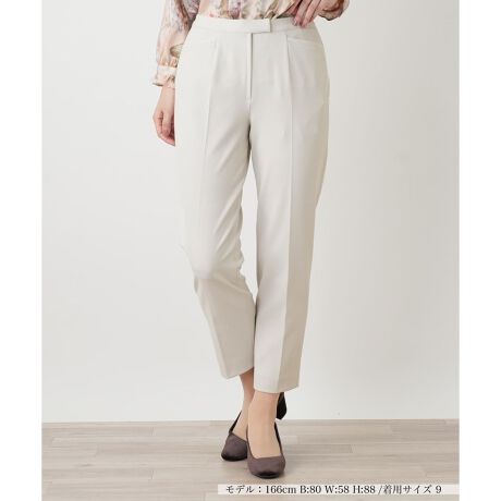 初夏のデイリーシーンに軽快さを添える、スマートな佇まいのクロップドパンツです。足首を覗かせる丈感が着こなし全体に爽やかな抜け感と女性らしさを演出します。肌当たりのよいしなやかなコンフォートストレッチ素材を使用しており、やや薄手の質感ながら、水や汚れを弾くはっ水加工が施されているため天候を気にせず着用可能。フロントホックの仕様がウエスト周りを端正に見せ、アクティブな動きにも美しく寄り添う汎用性に優れた一本です。