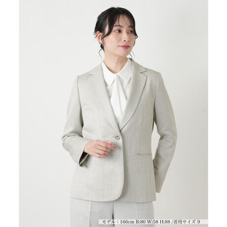 初夏のオケージョンやビジネスシーンを華やかに彩る、マニッシュな佇まいのテーラードジャケットです。繊細なラメを織り込んだやや厚手の生地が、光を優しく受け止めて上品な煌めきを放ちます。表地には適度な伸縮性があり、肩パッドを施した端正なシルエットながらしなやかで快適な動きをサポート。袖口のスリットが手元にさりげない抜け感を添えるアクセントに。同素材のボトムスとのセットアップで、より凛とした大人の女性を演出してくれる一着です。