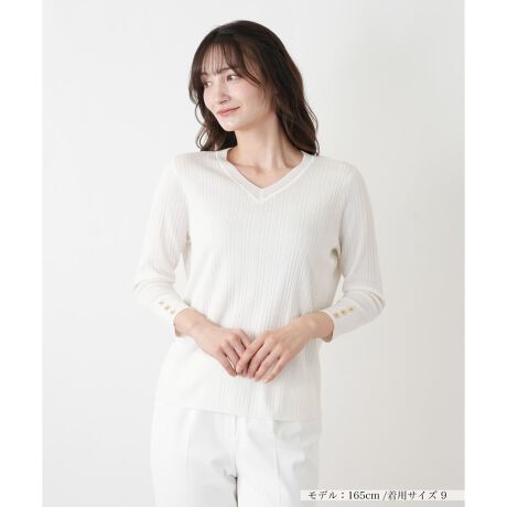 繊細なラメが全体に煌めき、春の光に映えるVネックニットプルオーバーです。すっきりとしたV字のデコルテラインが顔周りをシャープに演出し、スマートな大人の女性らしさを引き立てます。手首を軽やかに見せる七分袖の先には、小ぶりなボタンをあしらい、さりげないアクセントをプラス。伸縮性に富んだリブ編みの生地はやや薄手で肌馴染みが良く、一枚着としてはもちろん、ジャケットのインナーとしても上品に決まるトップスです。