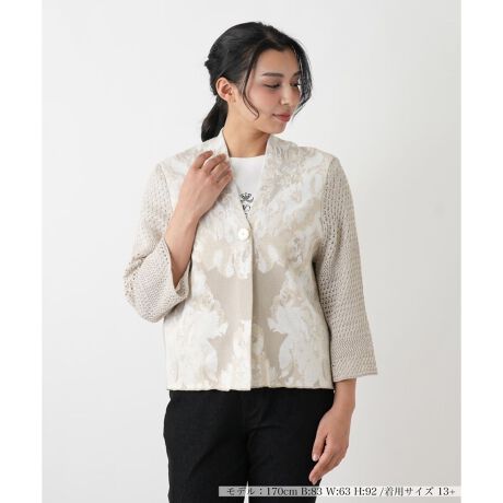 イタリアのニットブランド〈CINZIA CALDI〉から、夏らしい軽やかなニットジャケットが登場。全体に施された洗練されたフラワーモチーフのジャカードが、見る角度により輝き、エレガントな印象を与えます。ドロップショルダーや異素材の組み合わせが、リラックス感のある快適な着心地を実現。上品さとカジュアルさが絶妙に融合した、羽織るだけで様になるデザイン性の高い一着です。