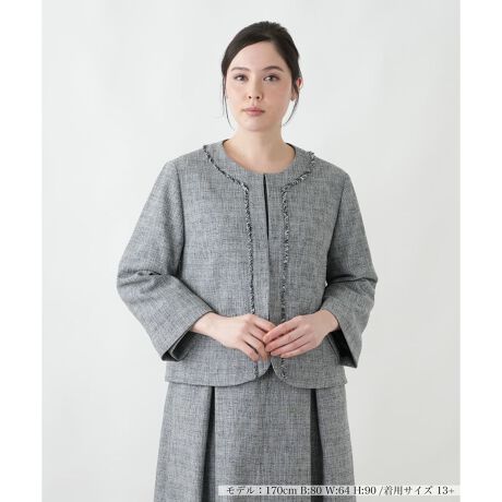 首元から前立てにかけてあしらわれたフリンジが、顔まわりに華やかな表情を添えます。複数の糸を複雑に織り交ぜることで生まれた、奥行きのある生地感が上品な印象です。すっきりとしたノーカラーのデザインと、丸みを帯びたフロントの裾が柔らかな雰囲気を演出。手首がのぞく袖丈が軽やかさをプラスし、洗練された装いを完成させます。