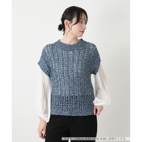 繊細に煌めくスパンコールとラメ糸を贅沢にミックスした、存在感のあるニットベストです。初夏の陽射しに映える透かし編みのディテールが、コーディネートに奥行きと軽快なニュアンスをもたらします。程よい厚みがありつつもストレッチ性に富んだ素材は、ブラウスやシャツなど様々なアイテムとの重ね着に重宝する仕上がり。シンプルな着こなしに加えるだけで、ワンランク上の上品なレイヤードスタイルを叶えます。