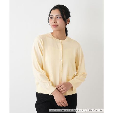 生地の全面に浮かび上がるように施された小さなドット模様が、控えめながらも豊かな表情を演出します。すっきりとしたクルーネックが上品な印象を与え、フロントに並んだ共布のボタンがデザインに統一感をもたらしています。両サイドに配されたパッチポケットは、さりげないアクセントとして機能します。袖口と裾はリブ編みで丁寧に仕立てられており、シルエットを心地よく引き締めています。