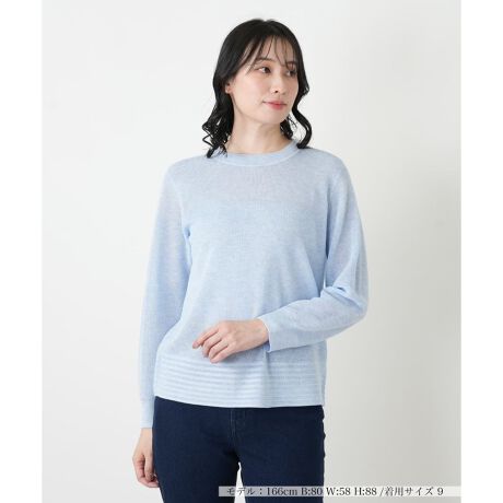 初夏の陽光に映える、爽やかなカラーリングのクルーネックニットプルオーバーです。裾周りに施されたニュアンスボーダーの編み模様が、シンプルな意匠にさりげないリズムと都会的なアクセントを添えています。さらりとした質感のやや薄手の編み地は、肌離れが良く清涼感のある着心地が感じられます。適度な伸縮性も備わっているため、デイリーカジュアルに取り入れるだけで洗練された大人のリラックススタイルを叶えてくれます。