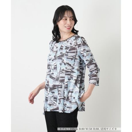 初夏の陽気に映えるアーティスティックな総柄が印象的なフレアカットソーです。すっきりとしたクルーネックと、手首を軽やかに見せる七分袖が洗練された心地よい清涼感を演出します。伸縮性に優れたやや薄手の素材は、肌離れが良くさらりとした生地感。緩やかに広がるシルエットが身体のラインを優雅にカバーし、シンプルなボトムスと合わせるだけで品のある大人の女性らしいカジュアルスタイルが完成します。