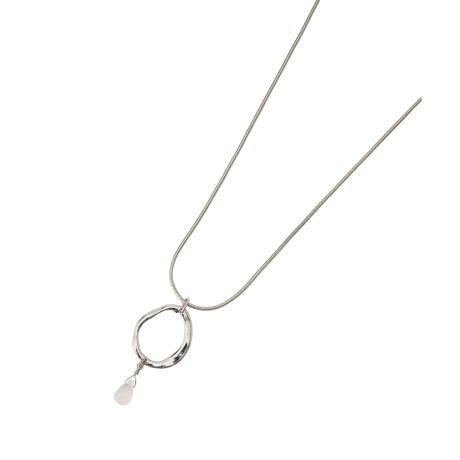 変形したオーバルフープに、一粒の天然石が揺れる繊細なデザインのロングネックレスです。ニュアンスのあるカラーとストーンの落ち着いた輝きが、胸元に洗練された大人っぽさを演出します。しなやかなチェーンを採用しているため、シンプルなニットやブラウスに合わせるだけで、着こなしにさりげない奥行きとこなれ感をプラス。日本製ならではの丁寧な仕上がりで、日常のコーディネートを品良く格上げしてくれます。