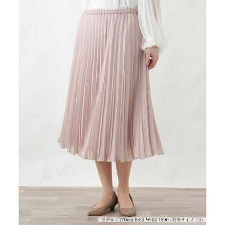 動くたびに優雅に揺れるプリーツが、女性らしさを引き立てるスカート。ウエストはゴム仕様で、締め付け感のない快適な穿き心地です。ご自宅でのお手入れがしやすい素材を使用しているため、デイリーに気兼ねなくお召しいただけます。シンプルな無地のデザインは着回し力が高く、ブラウスを合わせればきれいめに、カットソーを合わせればカジュアルにと、様々な表情を楽しめる便利な一枚です。