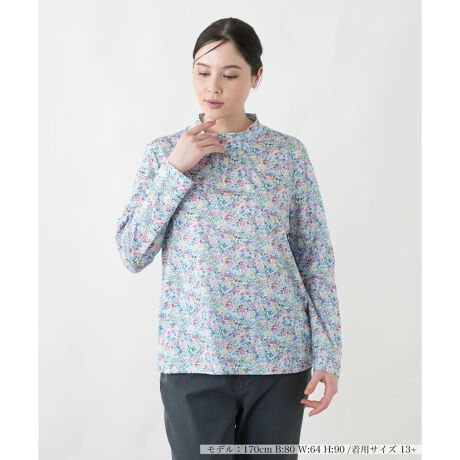 ピンクとブルーの美しいカラーミックスが目を惹く、華やかなプリントのカットソー。首元をすっきりと見せるハイネックデザインで、一枚ではもちろん、ジャケットやカーディガンのインナーとしても活躍します。ご自宅で簡単にお手入れができるのも嬉しいポイント。コーディネートの差し色として、装いを明るく彩ってくれるアイテムです。