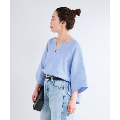チクチクせず柔らかく肌に馴染む風合いが特徴のリネンブラウス。