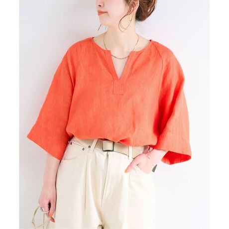 チクチクせず柔らかく肌に馴染む風合いが特徴のリネンブラウス。