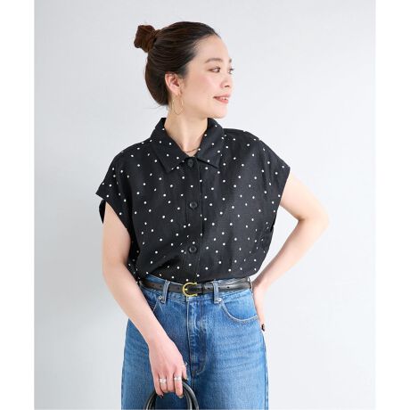 ヨーロピアンフラックスリネンにレーヨン混の落ち感のある平織り組織のリネン素材を使用。前あきの釦デザインで、少し大きめの釦がさりげないアクセントになっています。シャツ衿できちんと感がありながら、フレンチスリーブで程よく肩を覆い、抜け感のある印象になります。