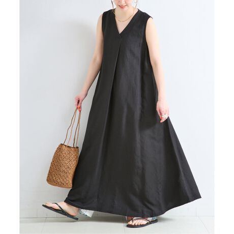 ヨーロピアンフラックスリネンにレーヨン混の落ち感のあるリネン素材のノースリーブワンピース。