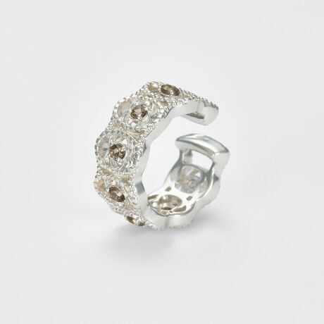 繊細な透かし模様が美しいシルバーイヤーカフ。7石のスモーキークォーツを贅沢に一周あしらい、落ち着きのある上品な輝きを添えました。透かし模様と天然石が奏でる軽やかなデザインは、どの角度から見ても美しく際立ちます。単品使いはもちろん、ピアスやイヤリングとのレイヤードで、耳元に洗練された個性をプラスします。※天然石や天然素材を使用しているものは、サイズ・色味・風合いの違いや、若干の傷、内包物の有無などに個体差があります。予めご了承ください。※摩擦や他のものとの引っ掛けなどで取れたり破損することがありますのでご注意ください。※着用や着脱する際に、他の衣類や髪の毛などに引っ掛かることがあります。着用する際は耳にフィットするように軽く押さえ、脱落しないことを確認してください。