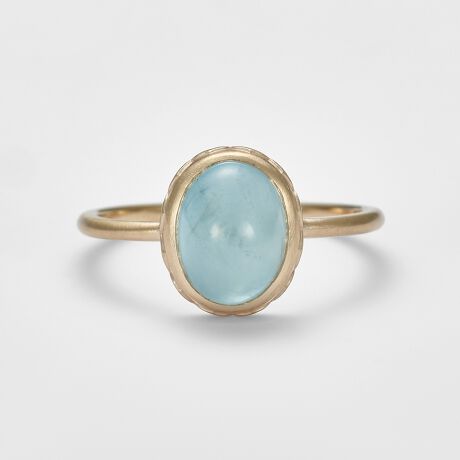 やわらかなブルーが魅力的なアクアマリンを、カボションカットで仕上げたリング。みずみずしい透明感と穏やかな輝きが、装いにさりげない華やぎを添えます。石枠にはクラフト感のあるマットで仕上げ、艶やかな石の美しさを際立たせています。少し大きめのサイズが、ひとつでもしっかりとした存在感を放ちます。柔らかな色合いは、春のスタイルに自然に馴染みます。3月の誕生石としてもおすすめのアイテムです。※天然石や天然素材を使用しているものは、サイズ・色味・風合いの違いや、若干の傷、内包物の有無などに個体差があります。予めご了承ください。