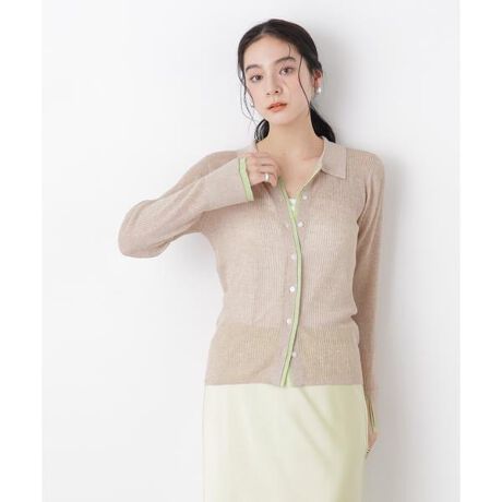 ほんのり透けるシアーリブが女性らしい柔らかさと抜け感を演出するニットカーディガン。トレンド感のある衿付きデザインや、前立てと袖口から覗くバイカラーパーツも魅力のポイント。インナー次第でロングシーズン活躍してくれる一着です。