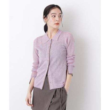 ほんのり透けるシアーリブが女性らしい柔らかさと抜け感を演出するニットカーディガン。トレンド感のある衿付きデザインや、前立てと袖口から覗くバイカラーパーツも魅力のポイント。インナー次第でロングシーズン活躍してくれる一着です。